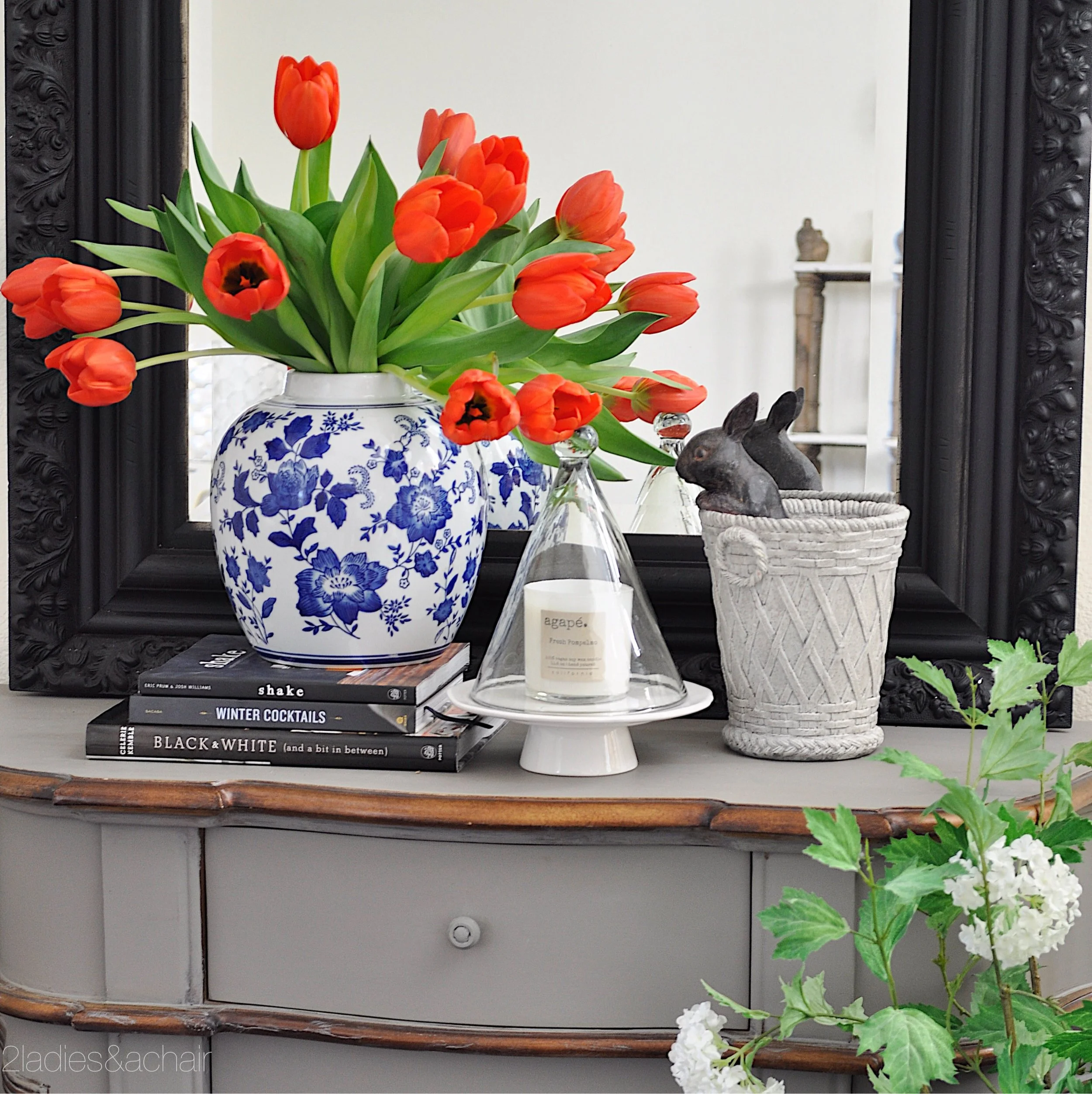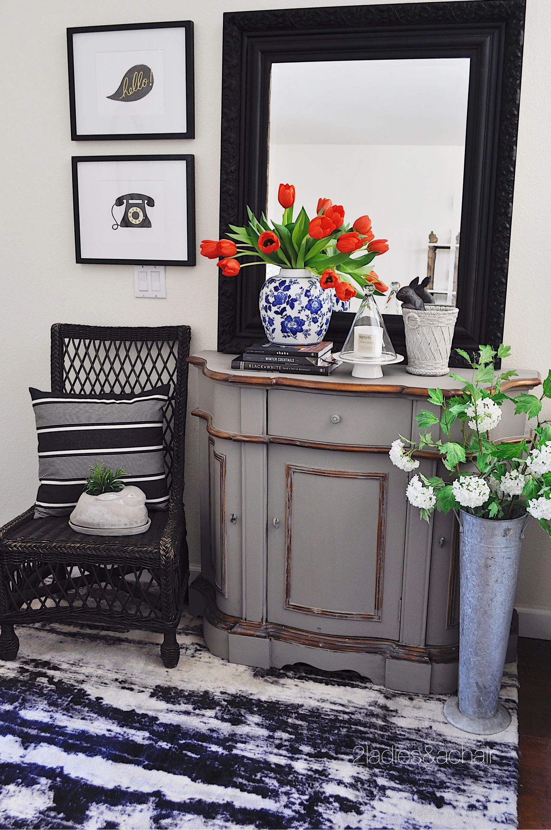 The bunnies have made an appearance in the entryway. In a couple weeks they will multiply around my home for Easter. These colorful orange tulips in a contrasting blue vase pop in my black and white entryway. I love the playful "hello" print welcoming my friends and family.