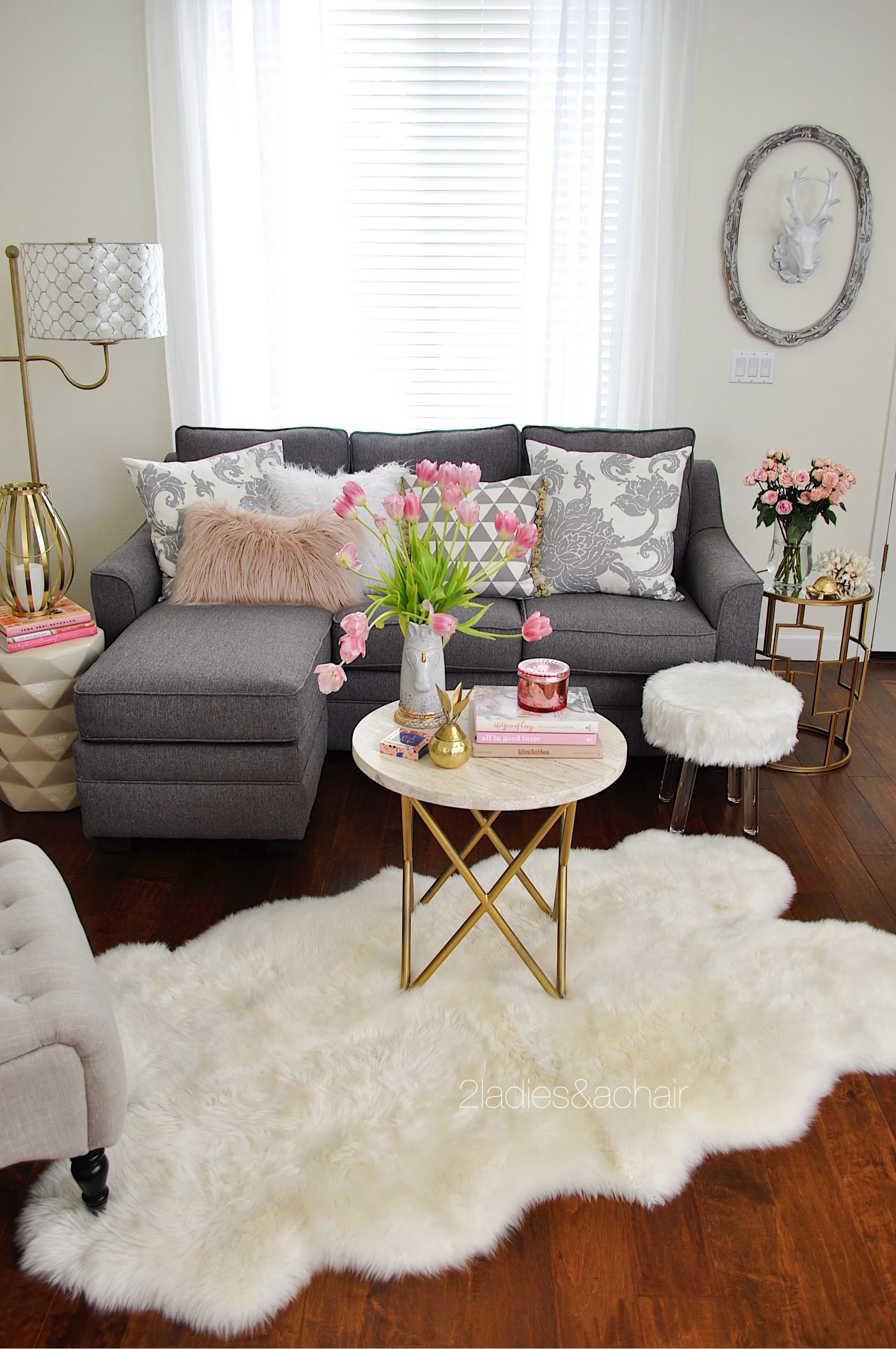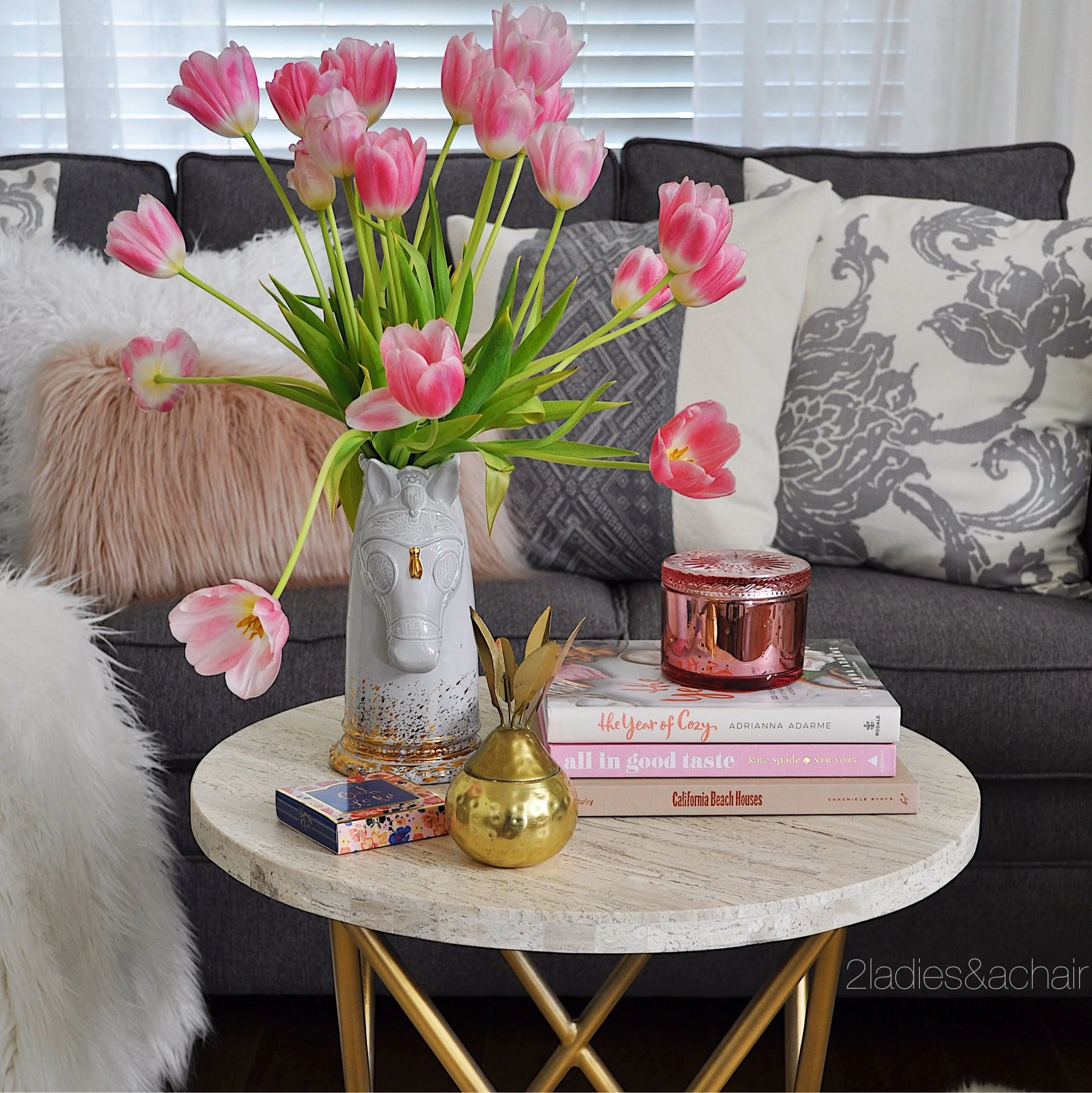Soft and inviting for spring, this simple blush pillow from HomeGoods set my color choice in the living room. I searched my books for pink jacket covers and found these gorgeous flowers to continue the color theme. Tulips are the ultimate spring flower! The grey floral print pillows soften up the hard lines of the sofa. The furry textures make this living room cozy and welcoming.