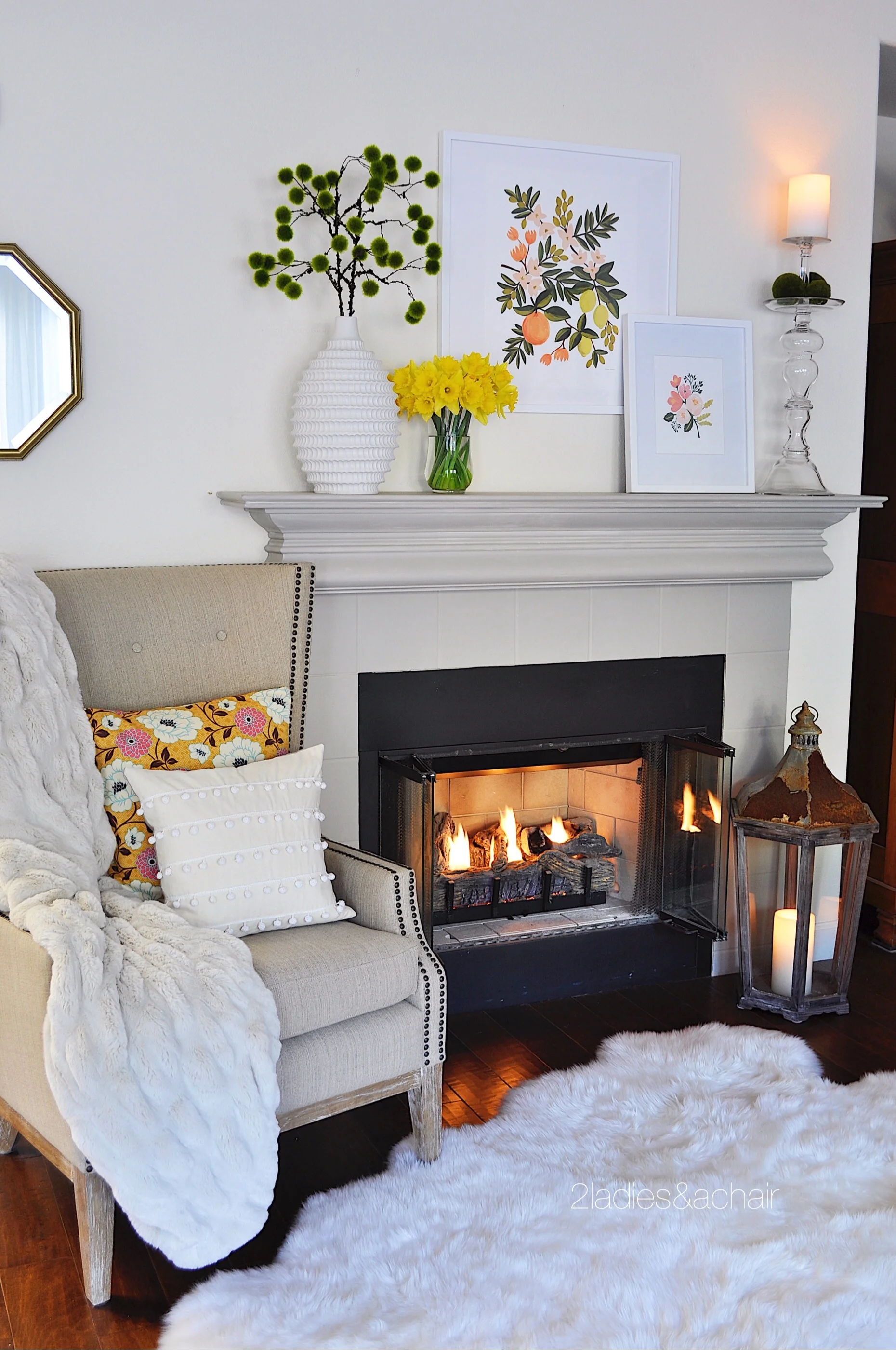 Daffodils scream spring! The mantel is fun and colorful this spring! The bold print is tamed with an interesting use of greenery, clear glass, and white. I love the added texture from this vase from HomeGoods.