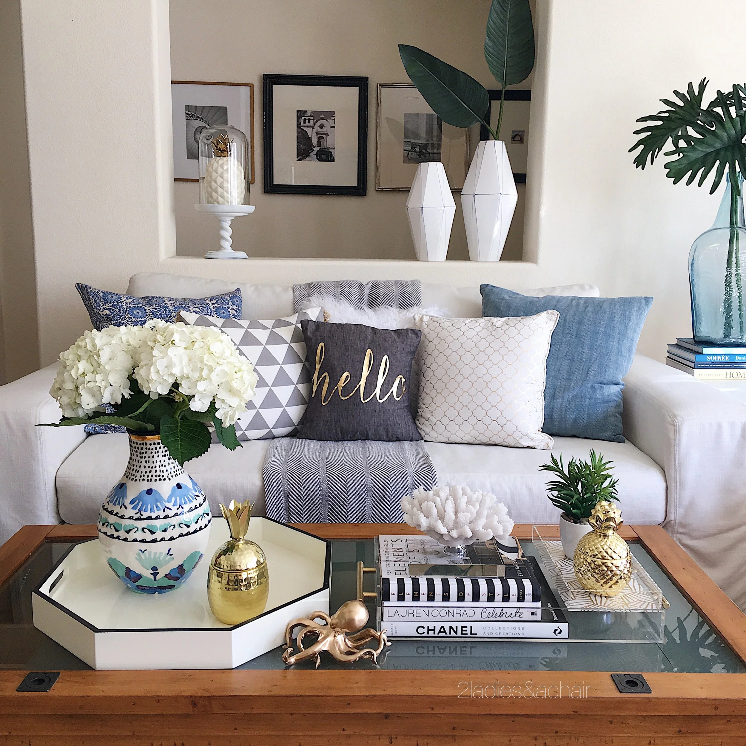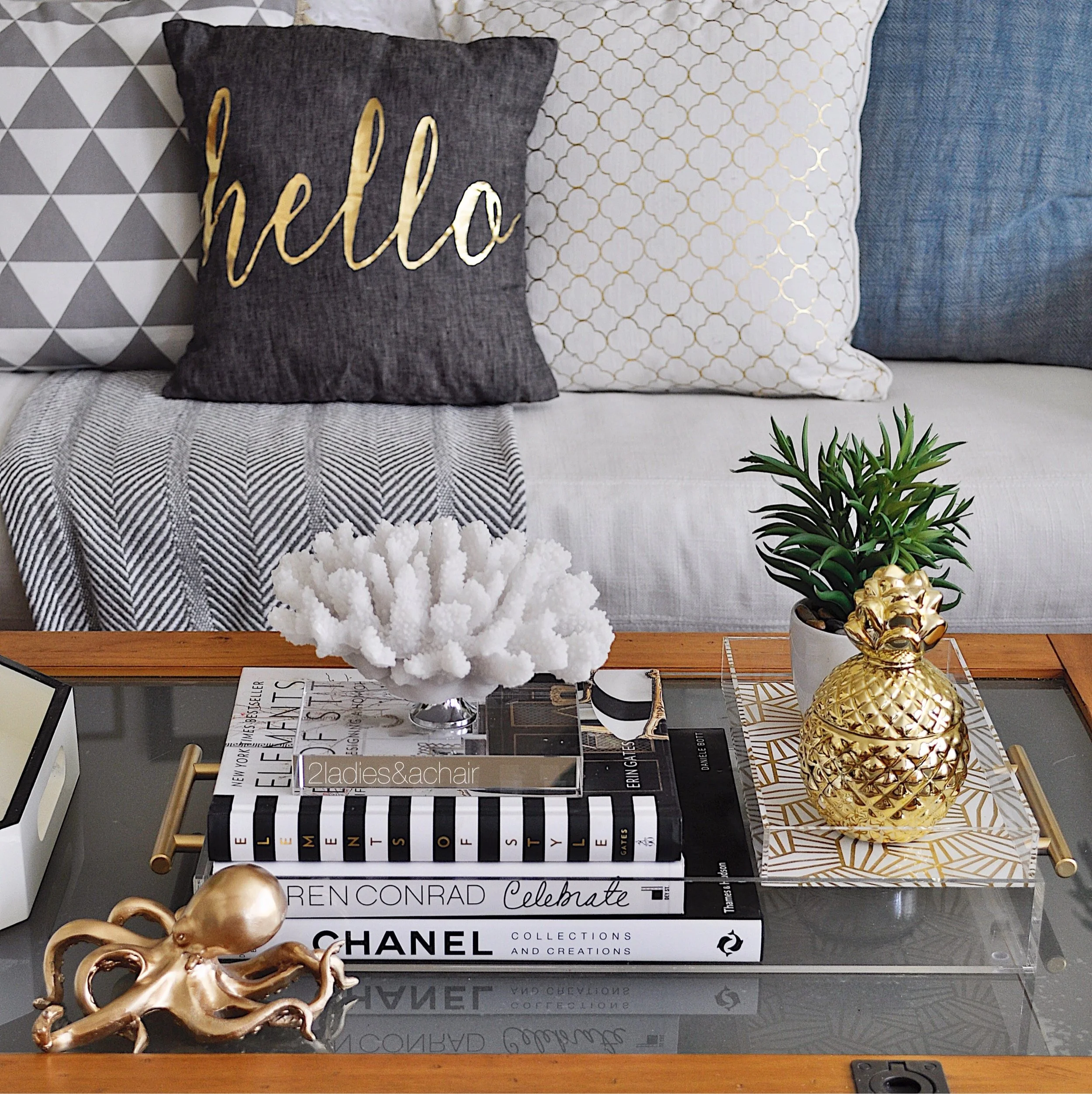 My accessory choices are in keeping with my light and bright spring theme. Clear lucite and white are warmed with touches of gold. A collection of pineapples are just what I needed here for interesting texture! I always add a personal touch of whimsy to every space making it my own. In this case it's this little gold octopus from HomeGoods.