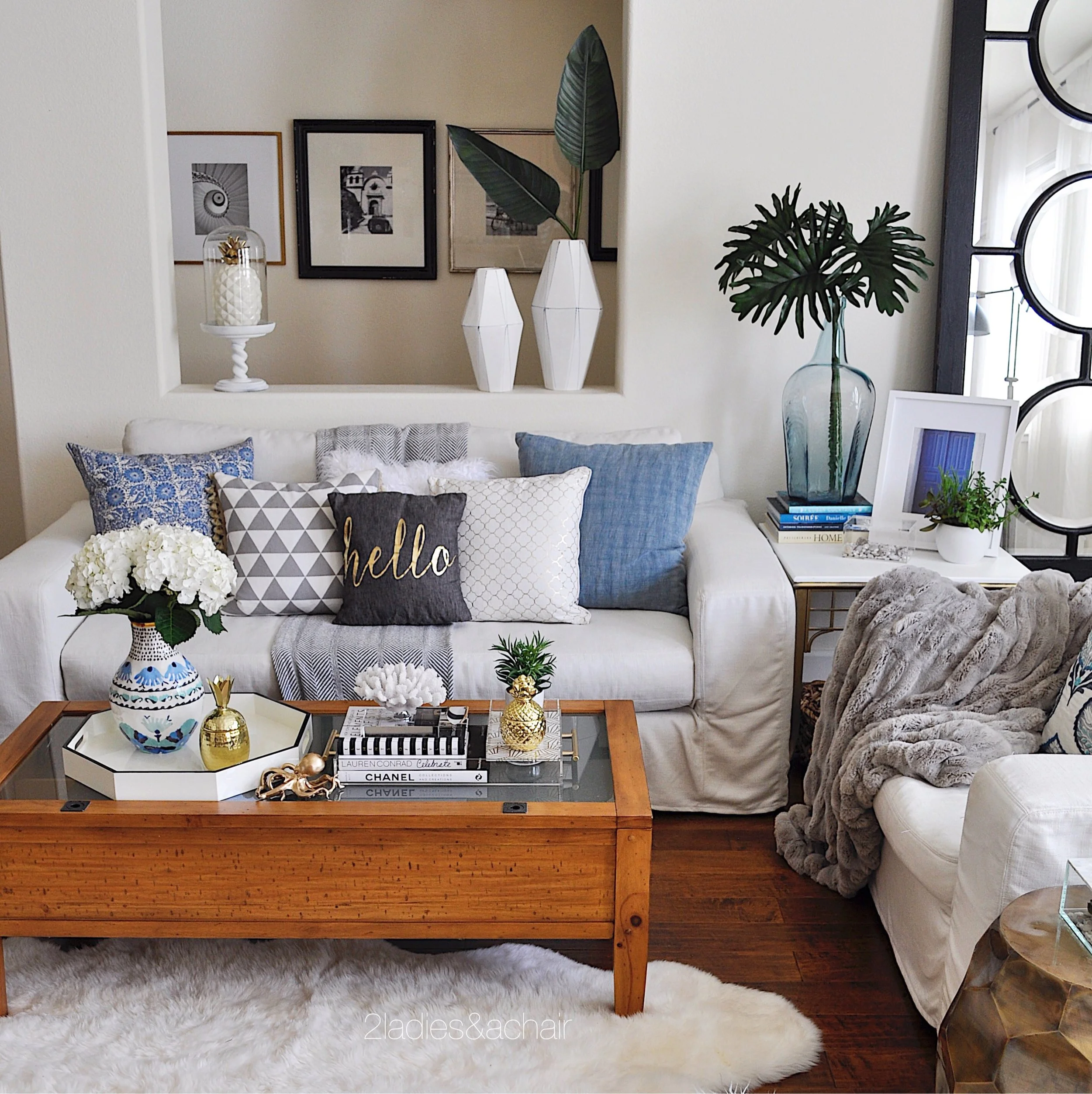 For the first time I went blue in my family room. I mixed in a few new purchases with my standard greys and whites and I love the relaxing results. I rolled up my thick ivory wool rug to lighten the look. The slip covered furniture and soothing blue color has created the perfect vibe for relaxing.