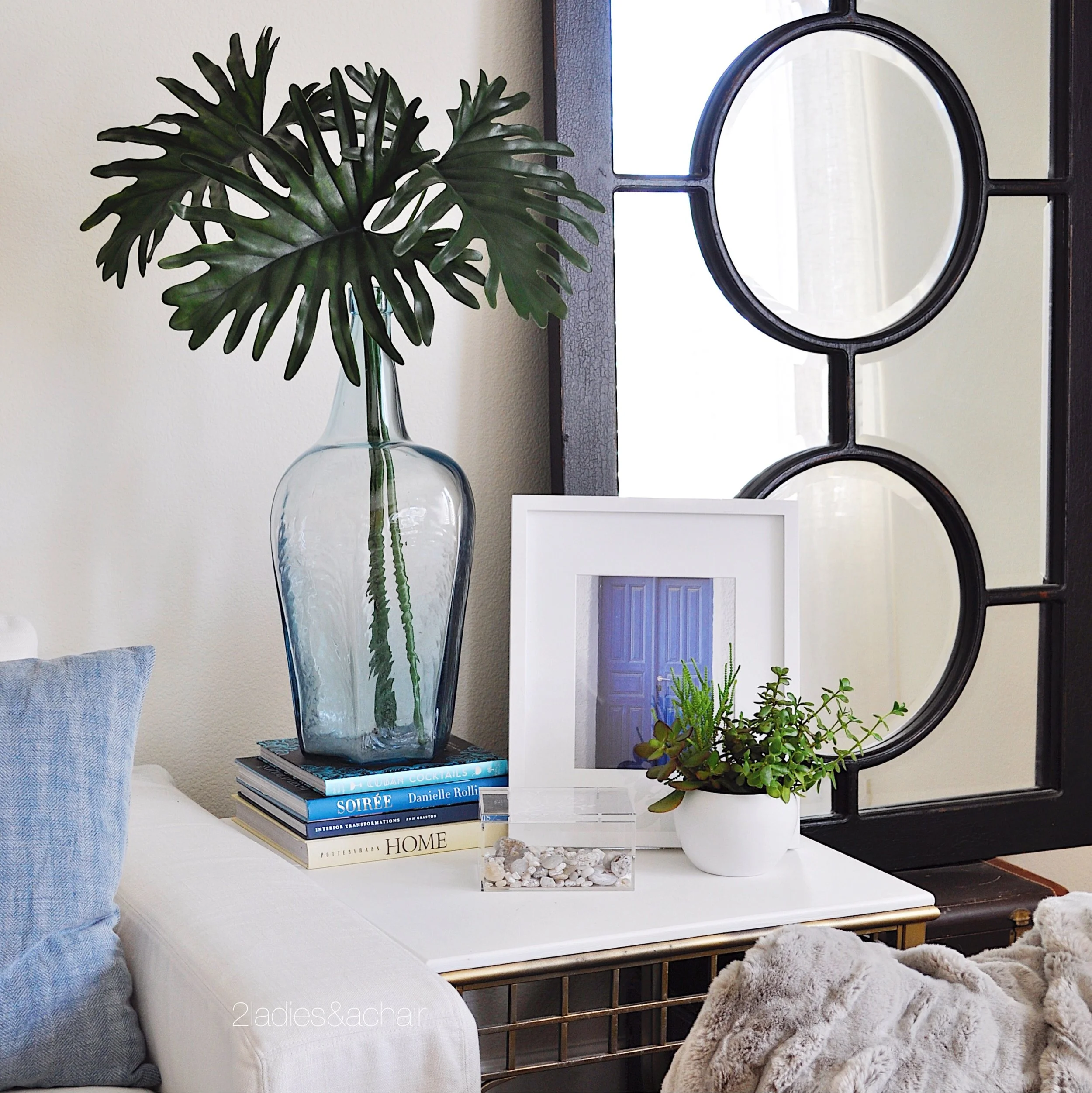The set of vases from HomeGoods were hand crafted in Portugal. The hand blown blue glass bottle was rescued from my backyard. These items add an artisan touch. Bringing in the outdoor colors and textures of spring with these faux green leaves and succulents from HomeGoods.