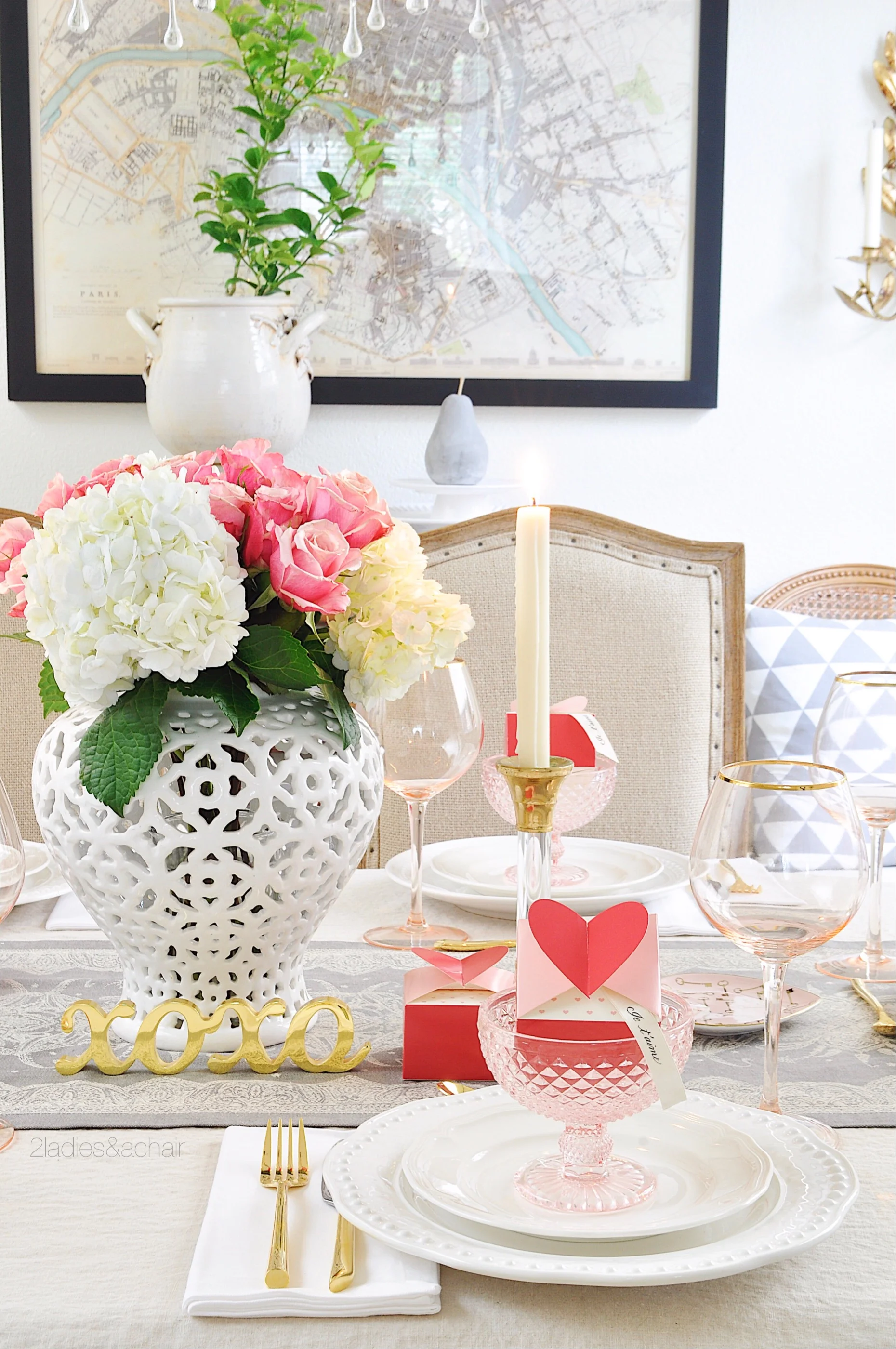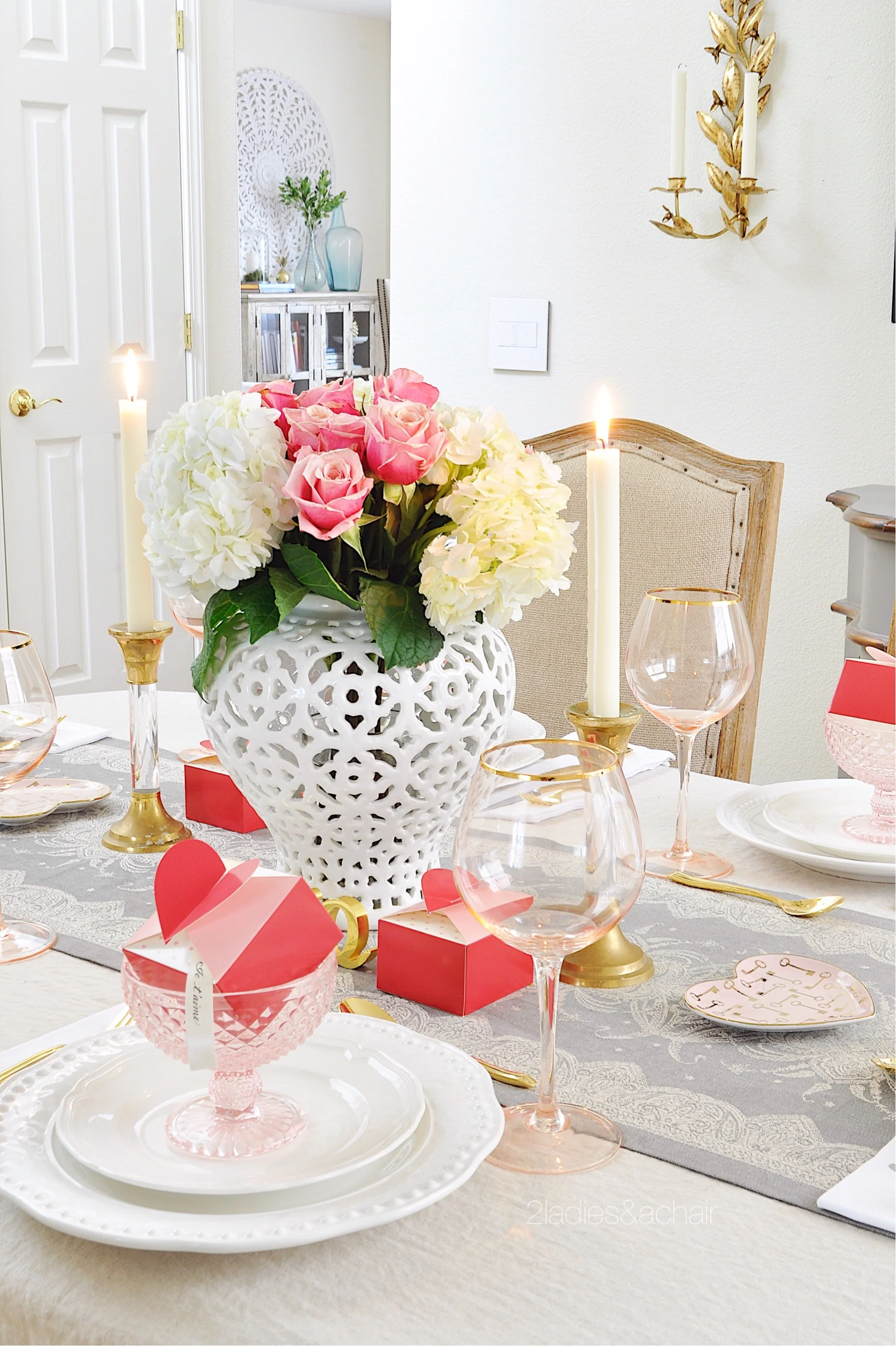 I definitely think roses for Valentine’s Day table decor! For contrast I added white hydrangeas; they also make the bouquet more luxurious.