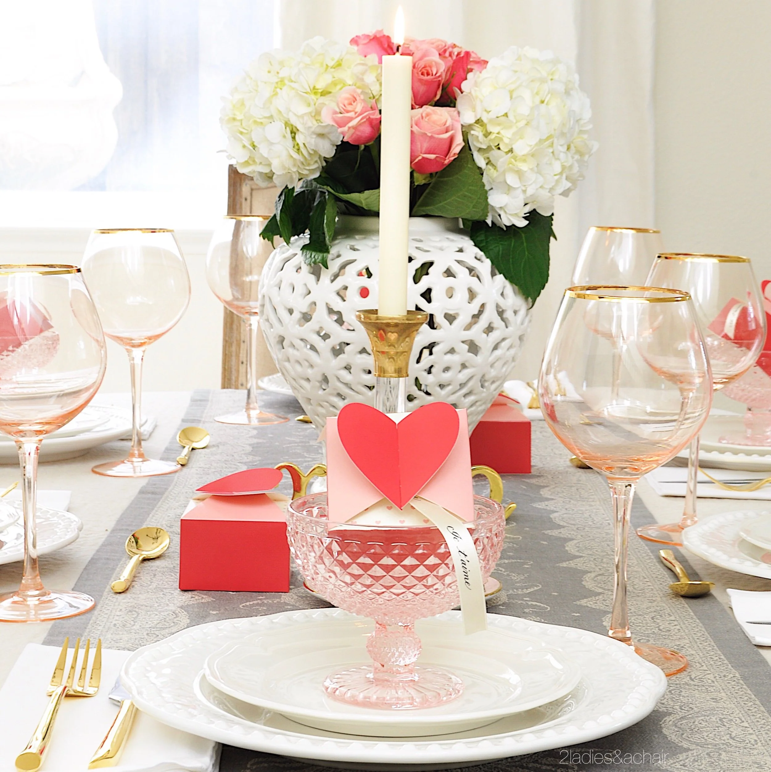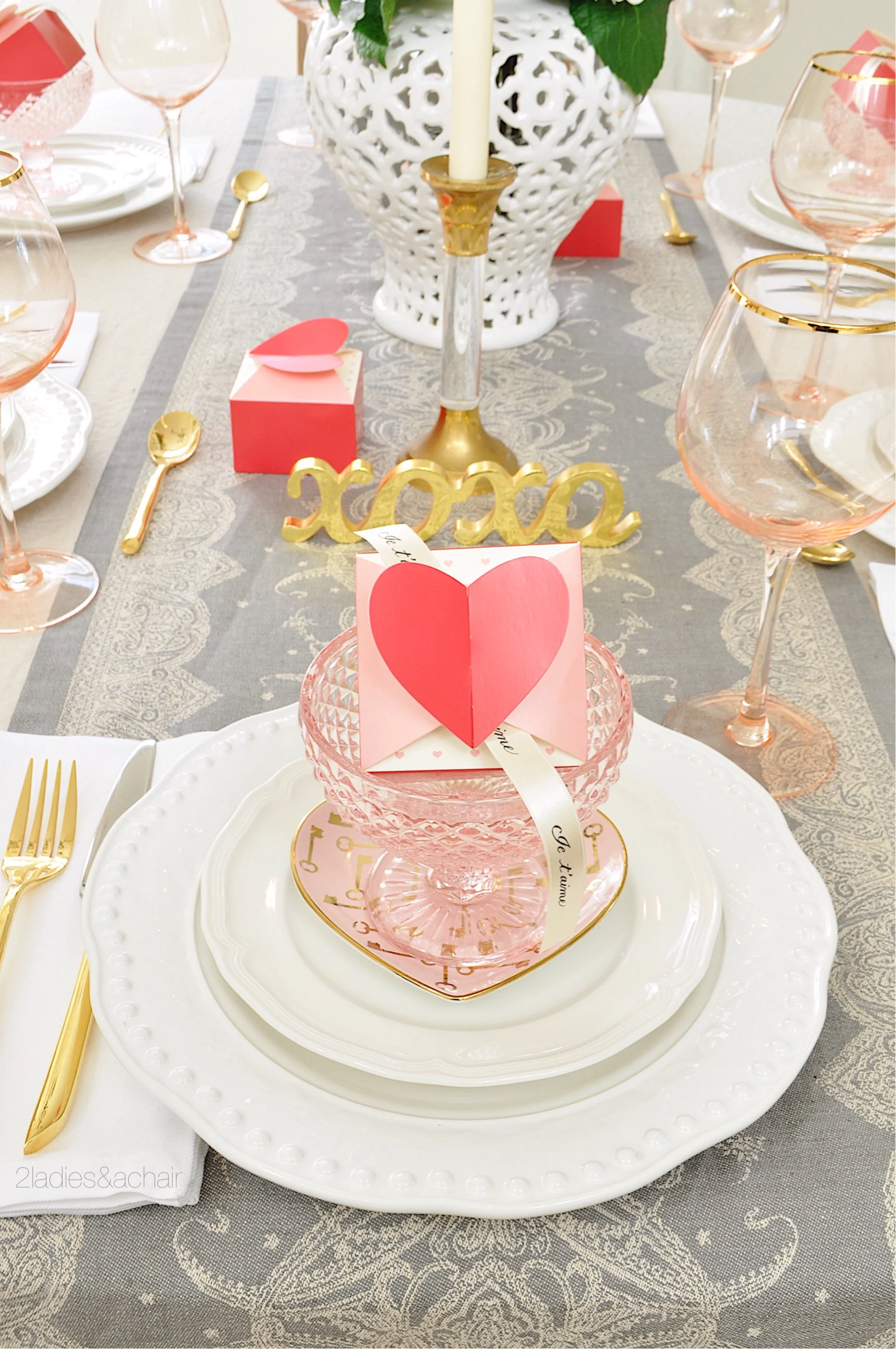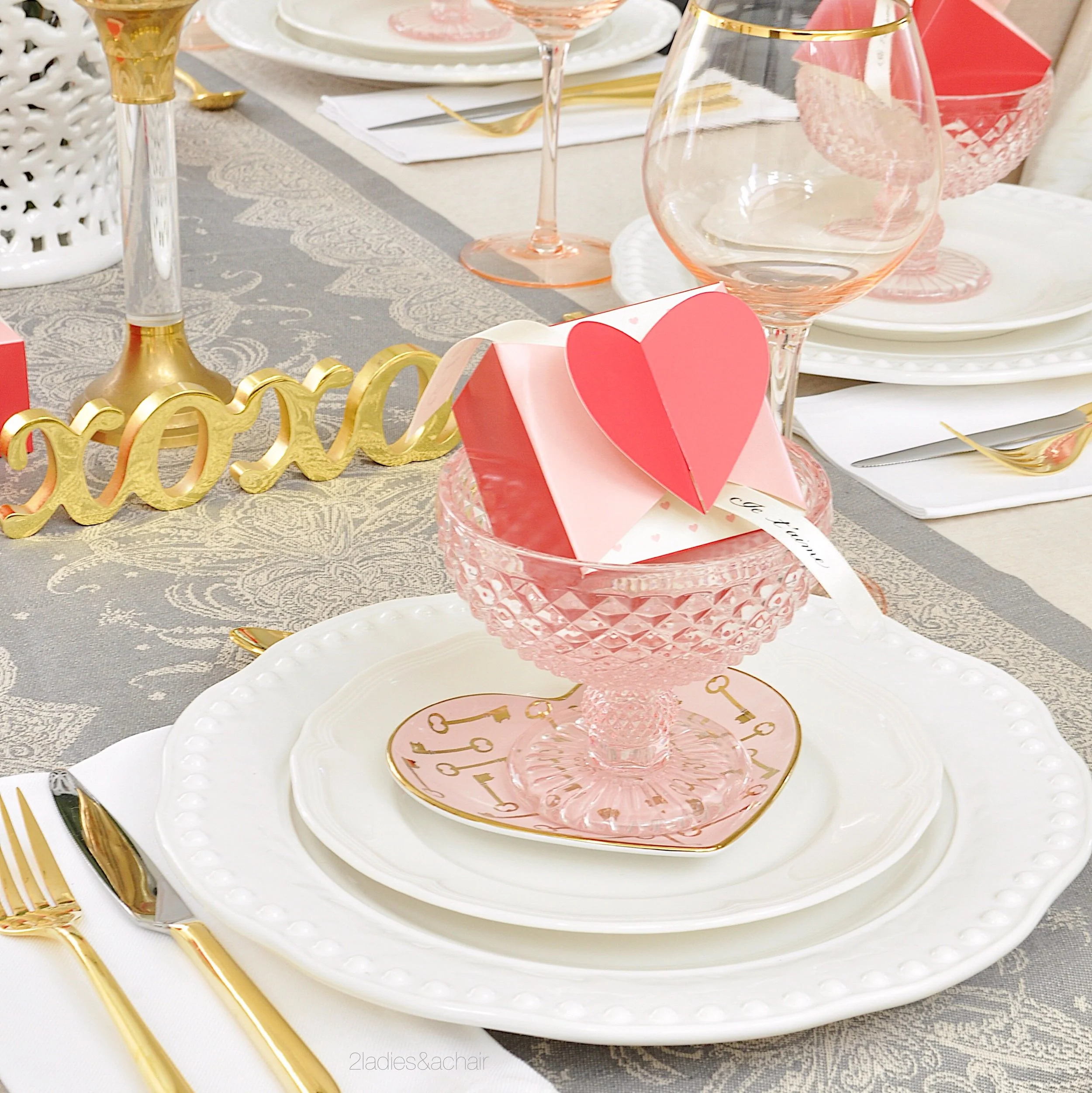 This year my easy Valentine’s Day table decor was planned around these cute small heart boxes I found at HomeGoods! I always check out their paper aisle!